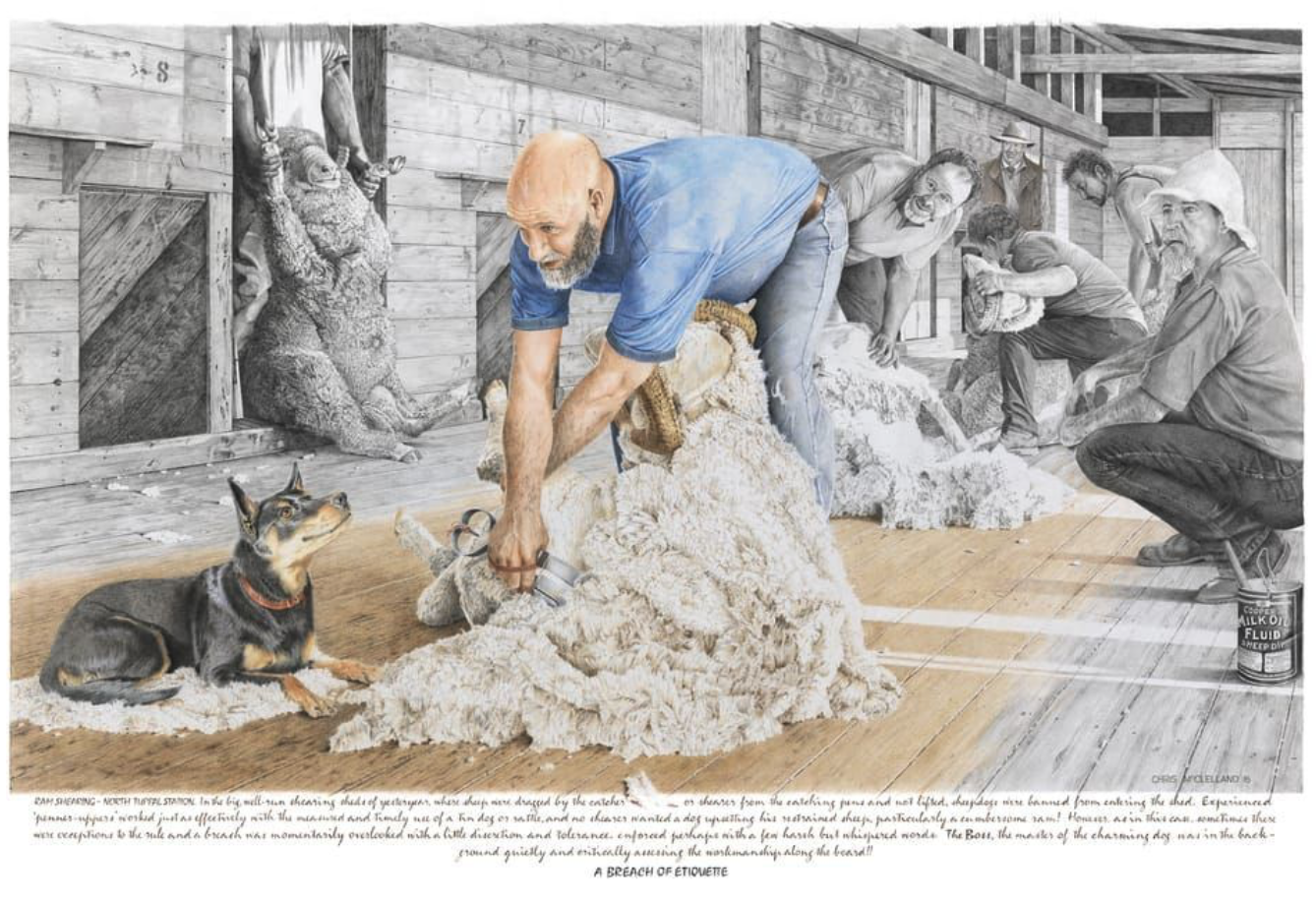Ram Shearing – North Tuppal Station. In the well-run big shearing sheds of yesteryear, where sheep were dragged from the catching pens and not lifted (Tom Roberts – Shearing The Rams), sheepdogs were banned from entering the shed. Experienced ‘penner-uppers’ worked just as effectively with the measured and timely use of a tin dog or rattle, and no shearer wanted a dog upsetting his sheep, particularly a cumbersome ram!
