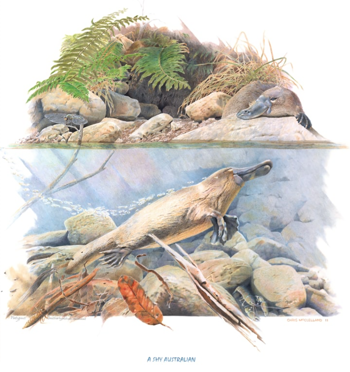 This drawing was commissioned for a friend in Northern N.S.W. Many artists paint platypuses under water with their eyes open when in fact they are shut. This creature has evolved a highly sensory duck-like bill, enabling it to locate its prey in turbid water without the need of sight.