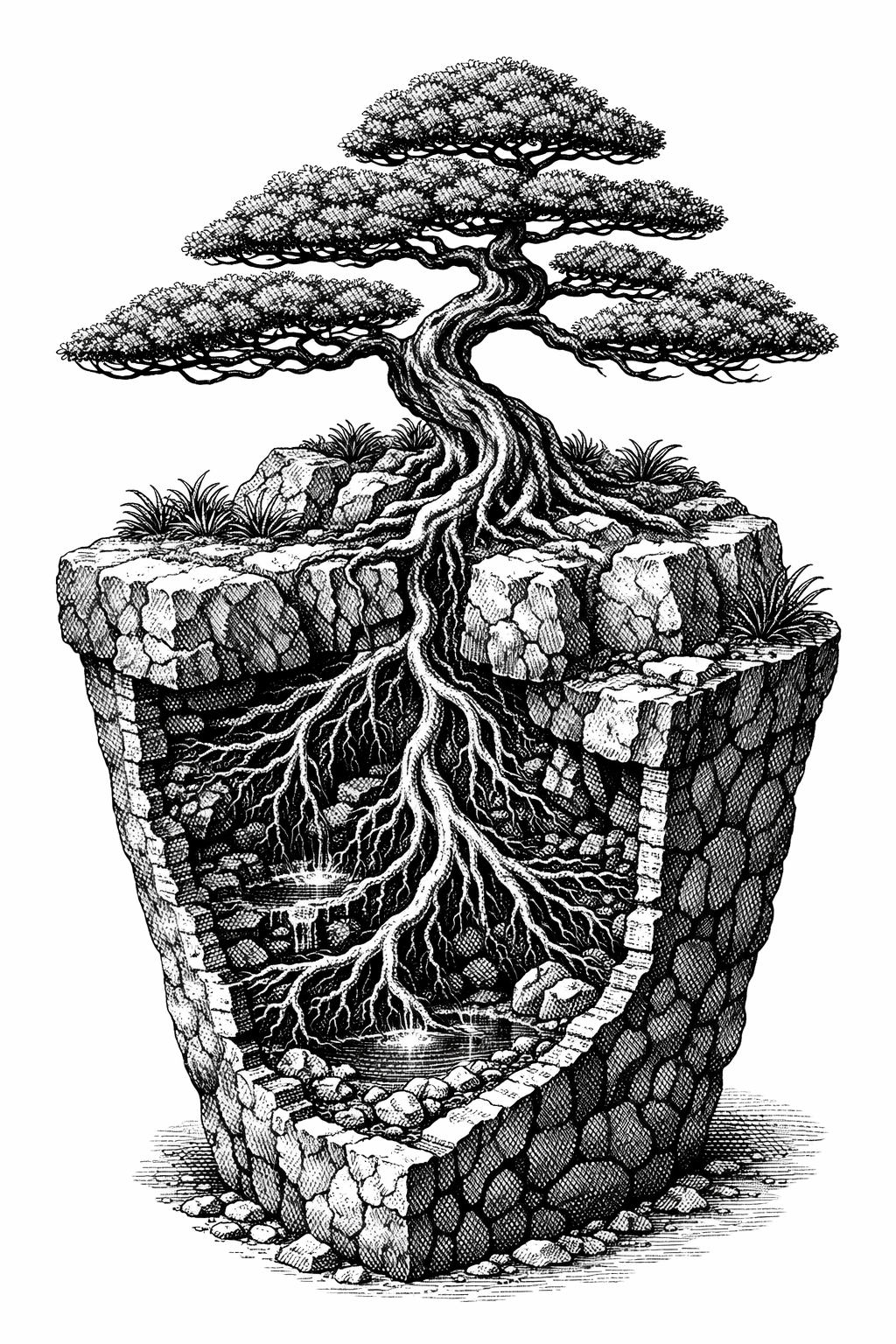 This image is a highly detailed line illustration of a bonsai tree shown in a dramatic cutaway view.