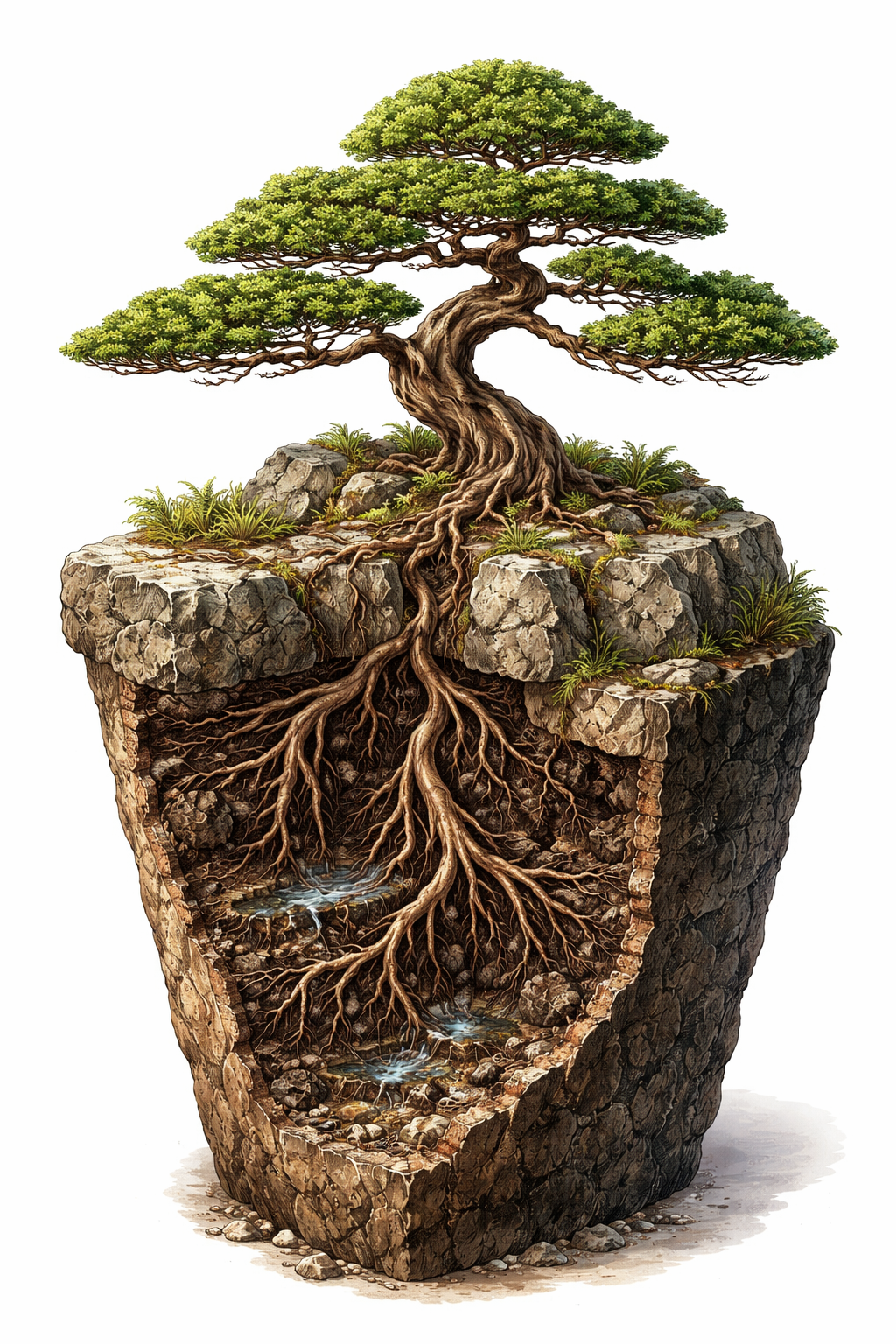 This image is a highly detailed illustration of a bonsai tree shown in a dramatic cutaway view.