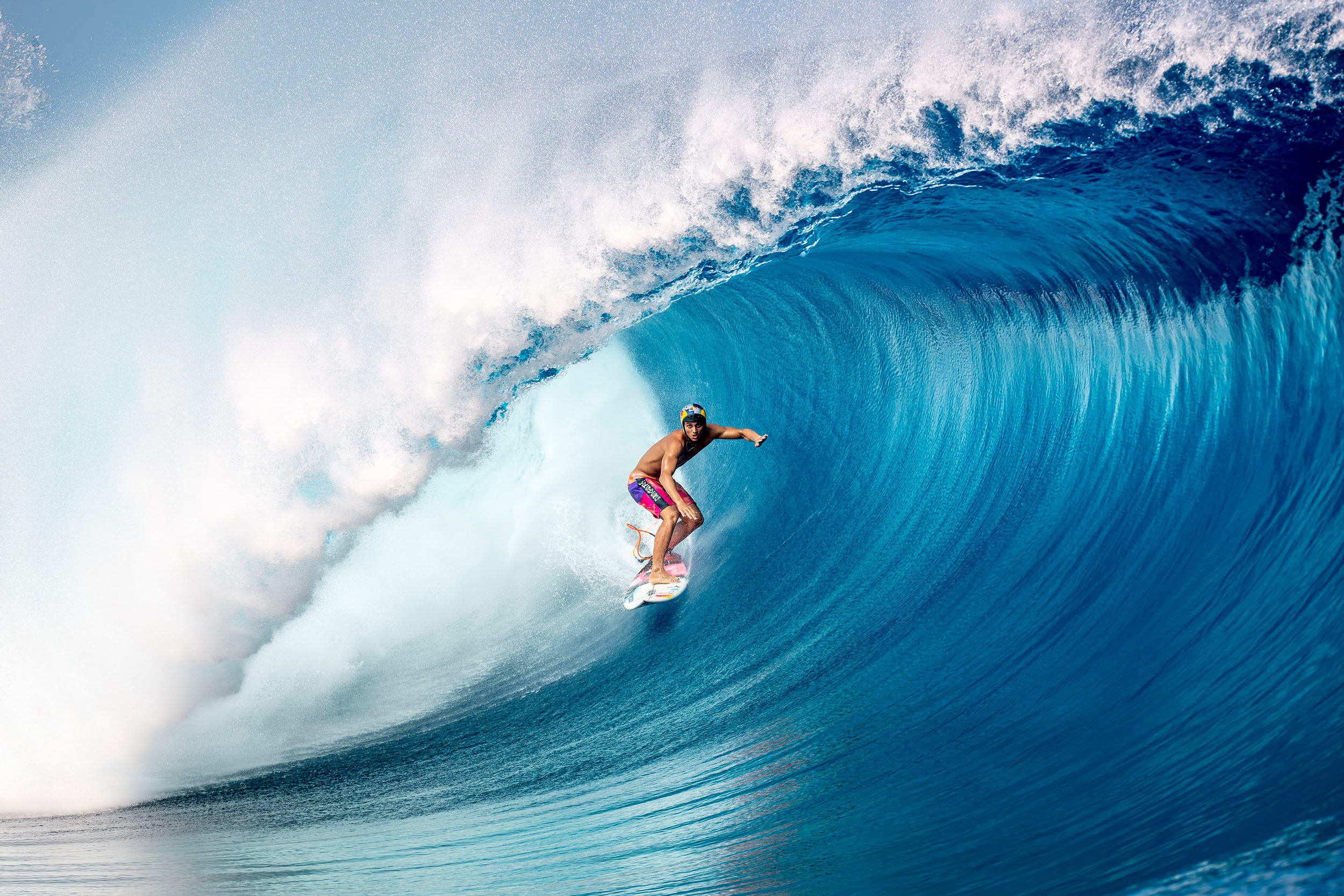 Kauli Vaast, the surfing Gold Medal winner, has proven himself a force to be reckoned with at the world’s most challenging surf breaks. At Teahupo’o, Tahiti; a wave renowned for its raw power and intensity, Kauli found himself deep inside one of the most flawless barrels ever ridden. With his fearless style and exceptional control, he navigated the heavy lip and thick walls of Teahupo’o with precision and ease, showcasing the skill that has made him a standout in competitive surfing. This image captures the essence of Kauli’s dedication and mastery – riding one of the most perfect waves in the world at the height of his surfing career.