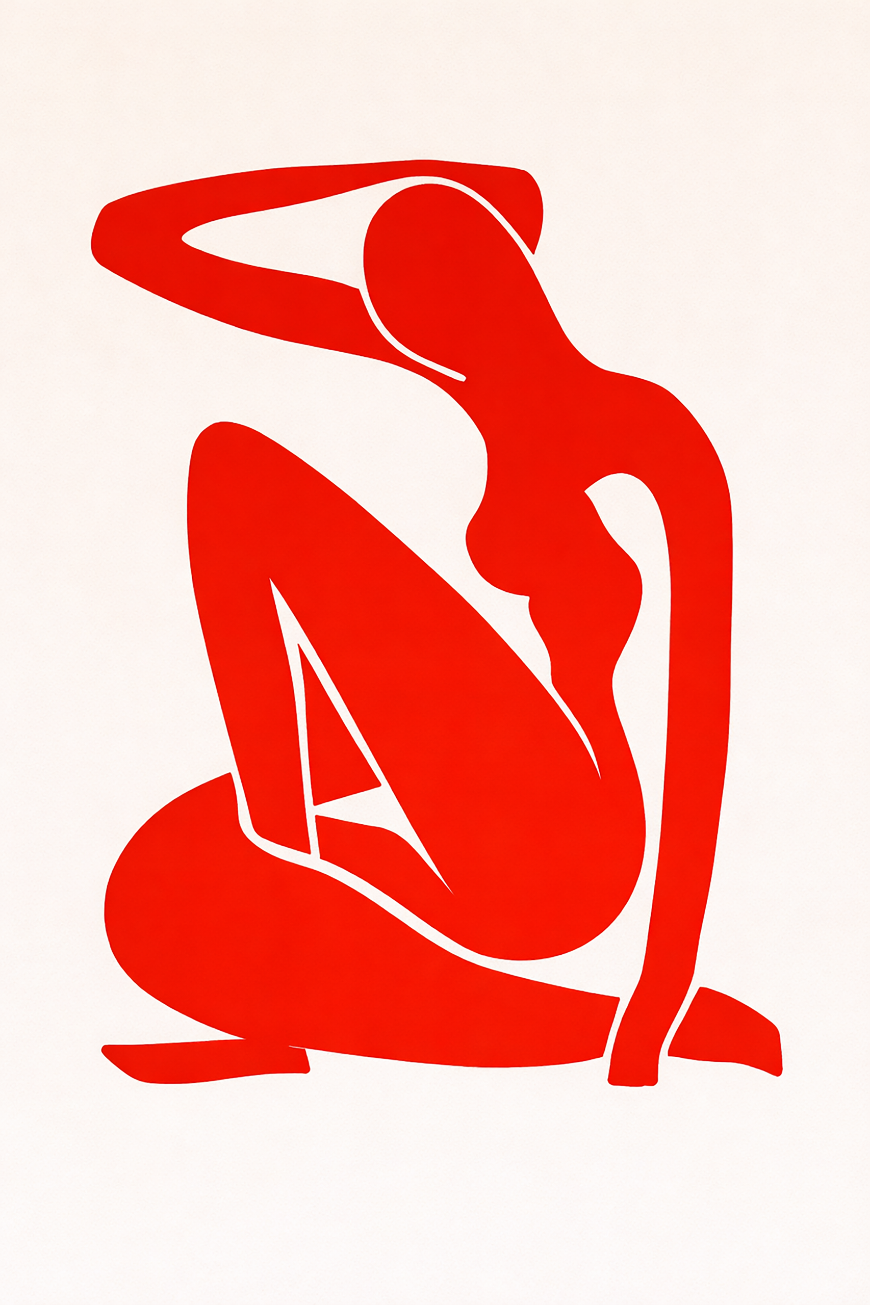 Elevate your space with the evocative beauty of the “Lady in Red” art print. This sophisticated piece draws deep inspiration from the iconic “cut-out” era of Henri Matisse, blending mid-century modern aesthetics with a raw, contemporary emotionality.
