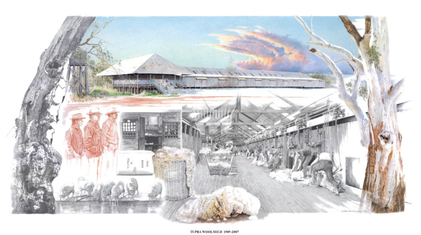 Tupra Woolshed is a coloured pencil drawing depicting the historic Tupra Woolshed on Tupra Station, just outside Hay, Australia. The artwork captures a quiet moment in the rural landscape, honouring the structure’s role in Australia’s pastoral heritage and the stories embedded in its weathered walls.
